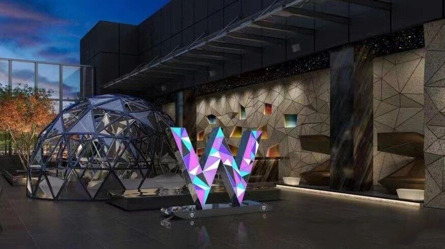 Corporate, Retail & Hospitality From executive luxury lobbies and shopping mall atriums to hotel entrances (like the W Hotel), our art brings sophistication and brand alignment. We fabricate everything from massive geometric metal pendant lamps and complex ceiling installations to futuristic, curved sculpture bars for lounges.